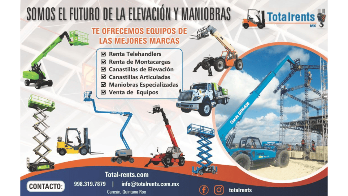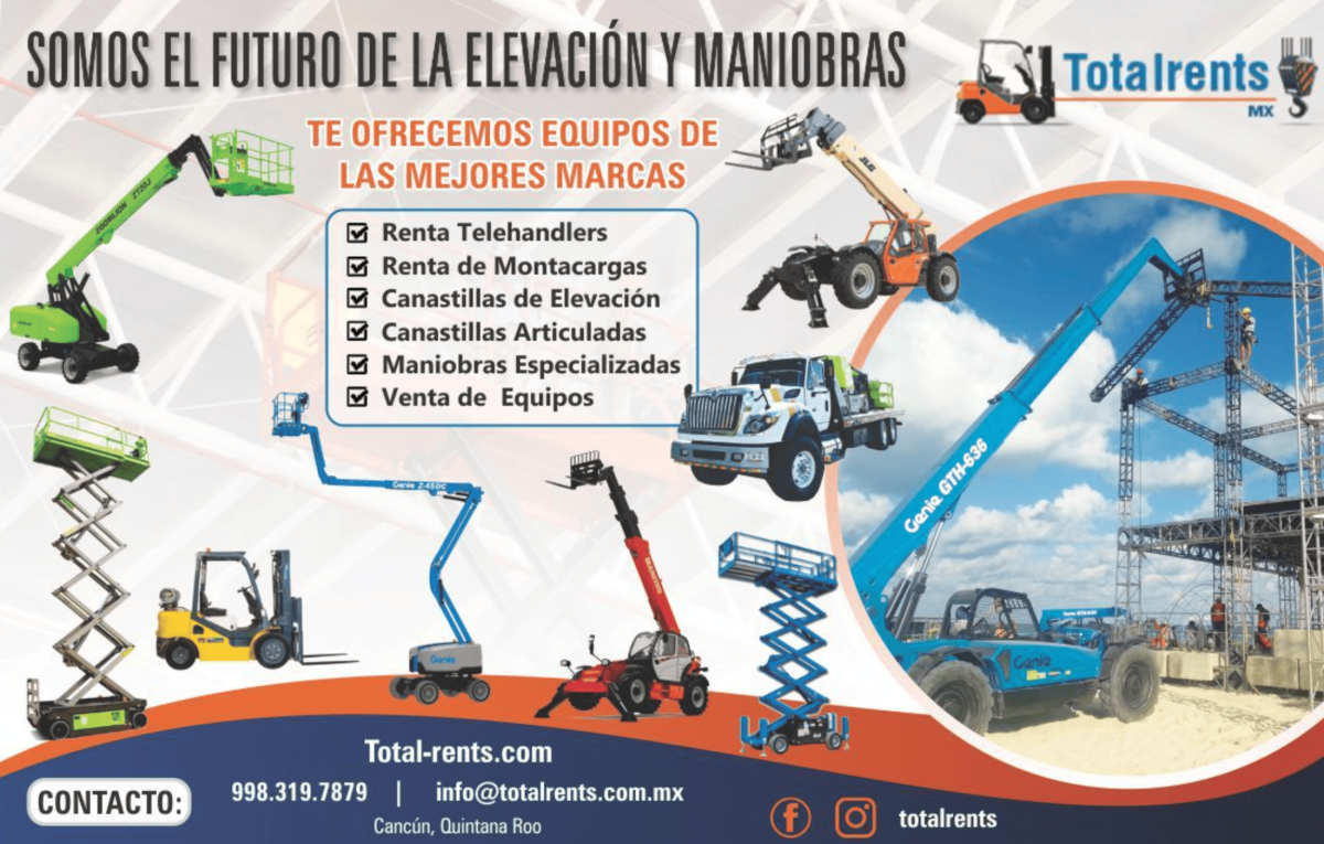 Renta de Telehandlers, Montacargas, Plataformas de Tijera, Plataformas Articuladas y Plataformas Telescópicas en Cancún, Quintana Roo. Maniobras Especializadas. Venta de Equipos.