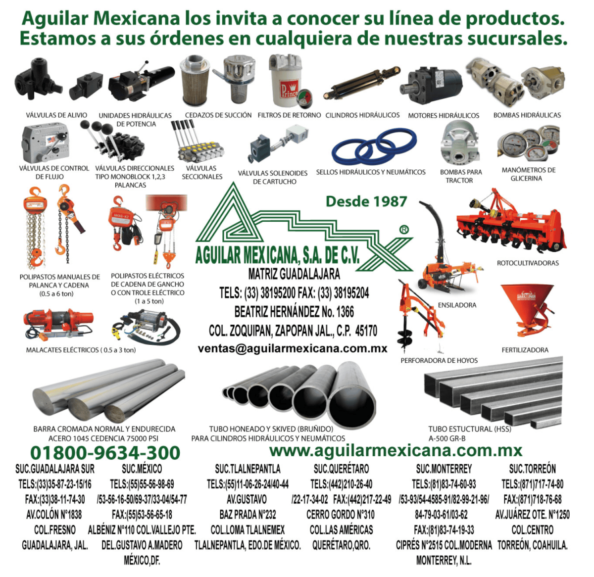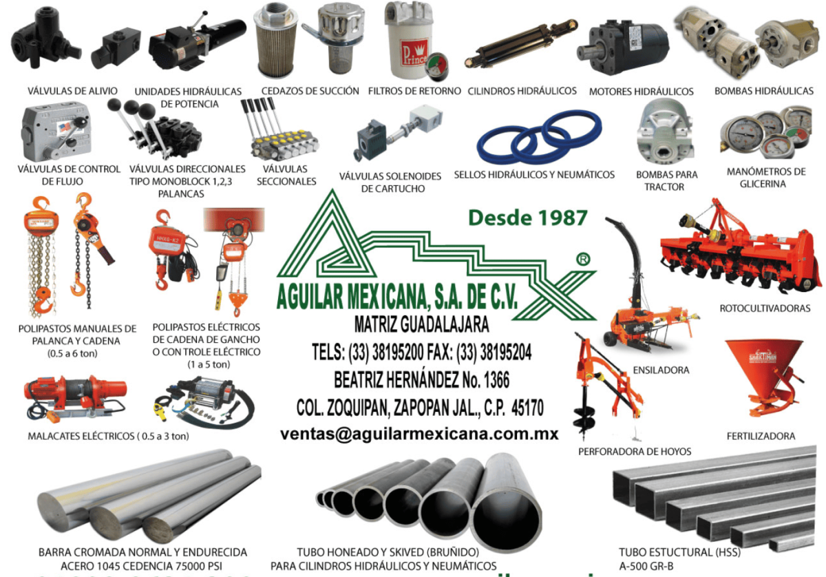 Barra cromada, Tubo para cilindros, Cilindros hidráulicos, Válvulas hidráulicas, Bombas hidráulicas, Motores hidráulicos, Unidades hidráulicas, Sellos hidráulicos.